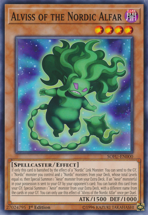 If only this card is banished by the effect of a “Nordic” Link Monster: You can send to the GY 1 “Nordic” monster you control and 2 “Nordic” monsters from your Deck whose total Levels equal 10, then Special Summon 1 “Aesir” monster from your Extra Deck. If an “Aesir” monster(s) in your possession is sent to your GY by your opponent's card: You can banish this card from your GY; Special Summon 1 “Aesir” monster from your Extra Deck with a different name from the cards in your GY. You can only use this effect of “Alviss of the Nordic Alfar” once per Duel.