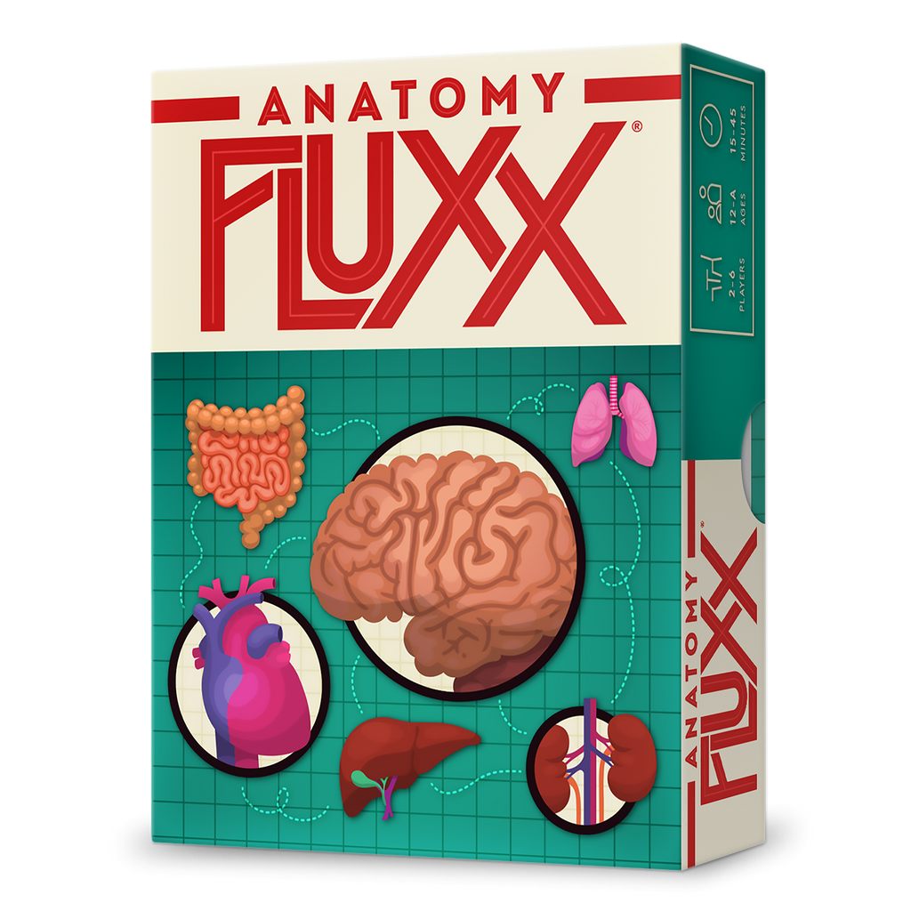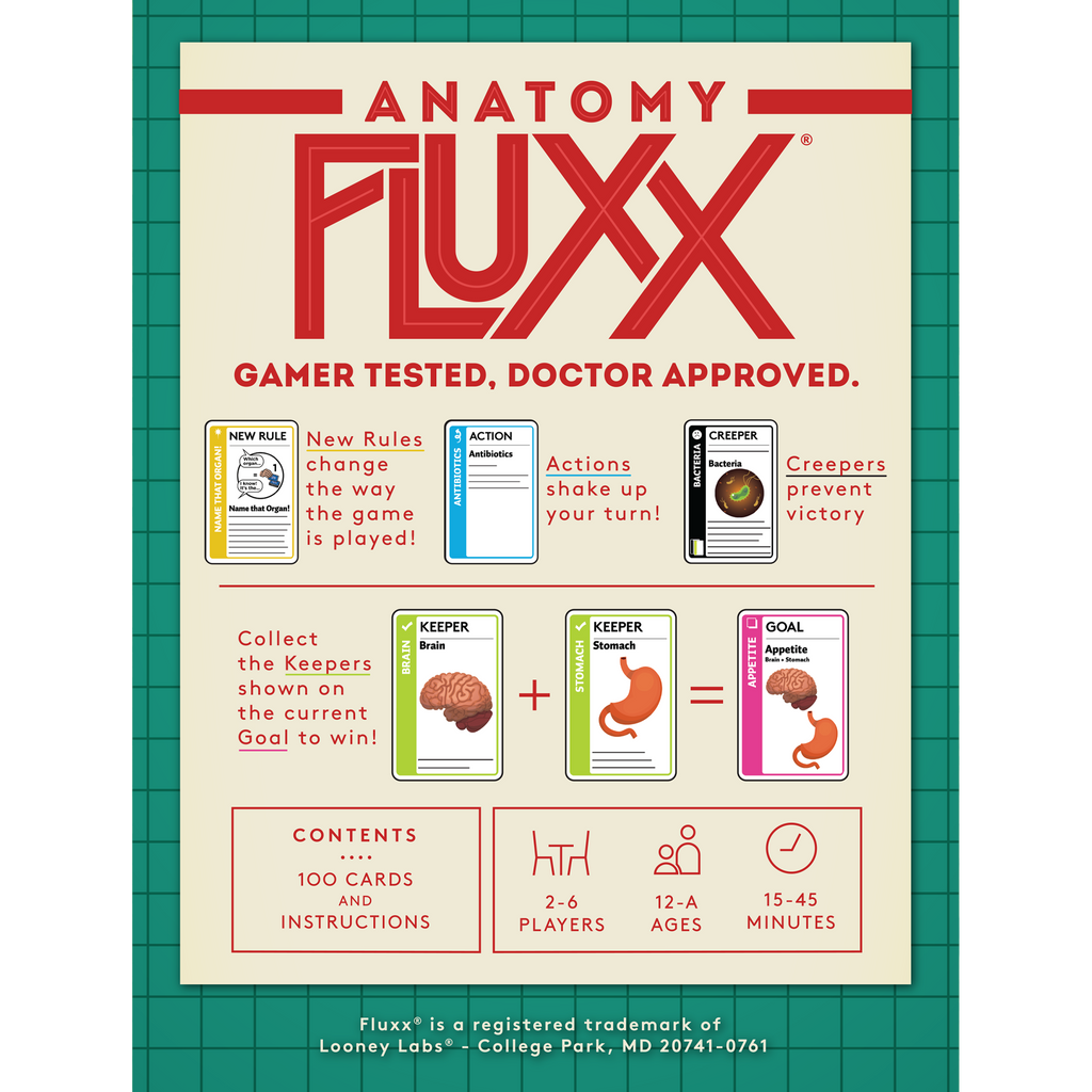 looneylabs.com/MAPP - Minimum Advertised Price: $19.95 Anatomy Fluxx takes you deep into the human body. From Bones to Blood Vessels, Anatomy Fluxx is packed with all the body bits that keep you ticking. But be on the lookout for Virus, Mutation, and Bacteria Creepers! Plus, two Learning Rules will get your Brain in gear with anatomical trivia. Anatomy Fluxx - for external use only! Comes with a free colorful display when you buy 6 copies! Players: 2-6 | Ages: 12+