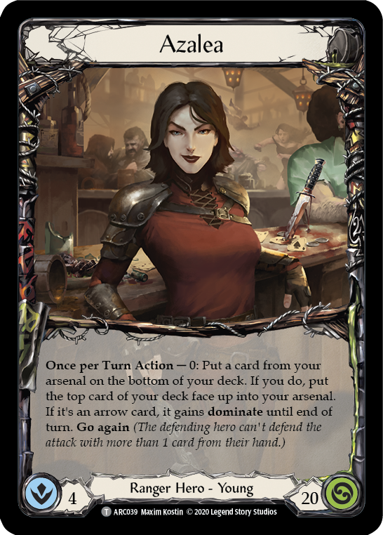 Once per Turn Action - 0: Put a card from your arsenal on the bottom of your deck. If you do, put the top card of your deck face up into your arsenal. If it's an arrow card, it gains dominate until end of turn. Go again (The defending hero can't defend the attack with more than 1 card from their hand.)